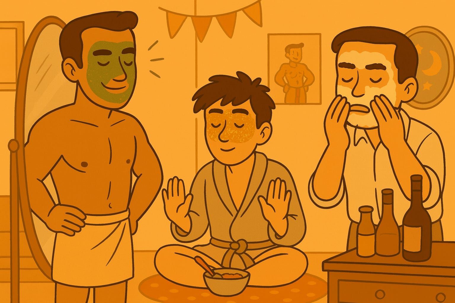 Ricky appeared behind Derek with a face mask smeared across his cheeks like war paint. “He’s not wrong though. The lighting in there is divine. I look like an influencer before the scandal.”