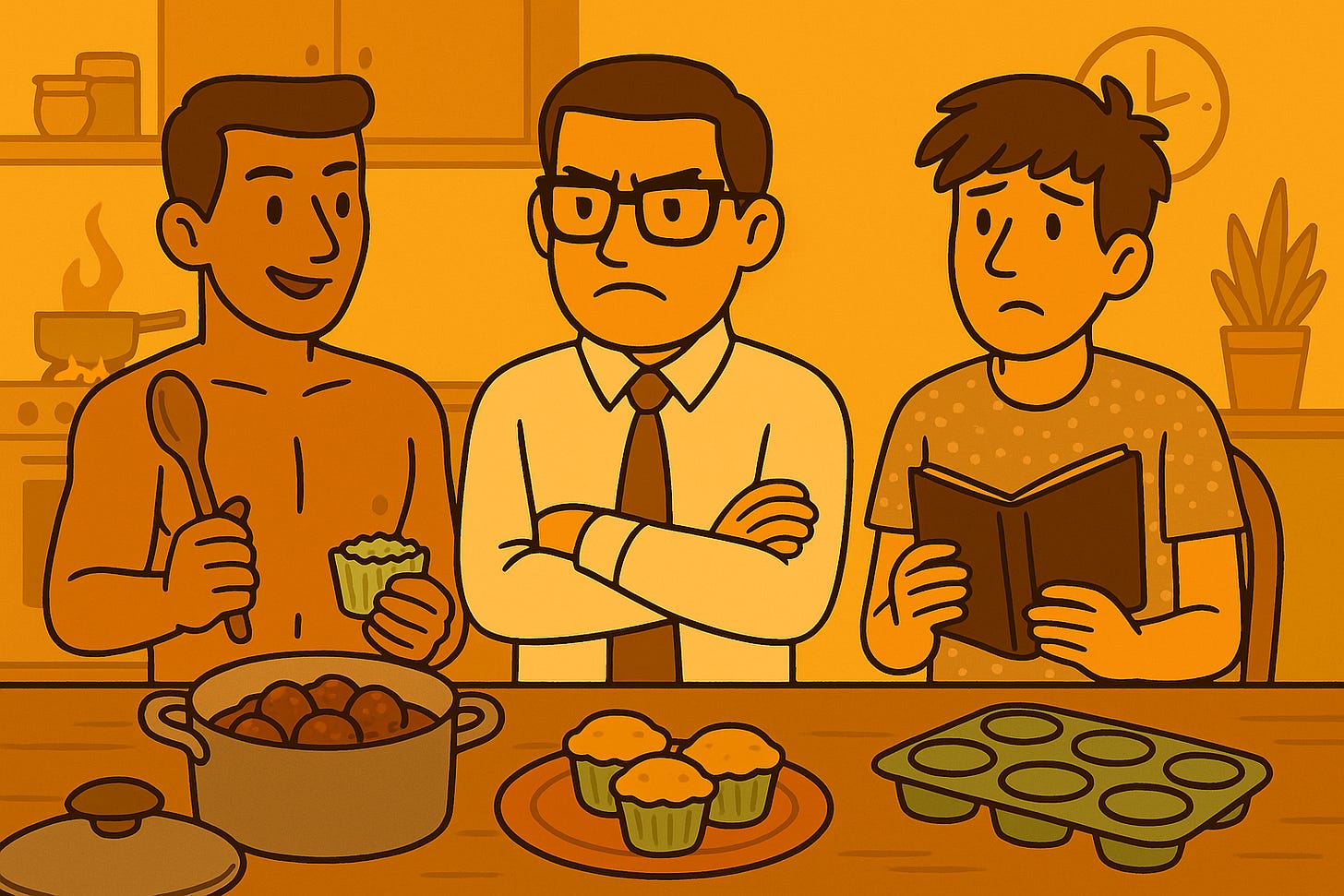 He stood in the kitchen wearing only an apron that read Kiss the Cook (But Ask First), brandishing a wooden spoon with the confidence of a man who believed culinary experience could be absorbed through vibes alone.
